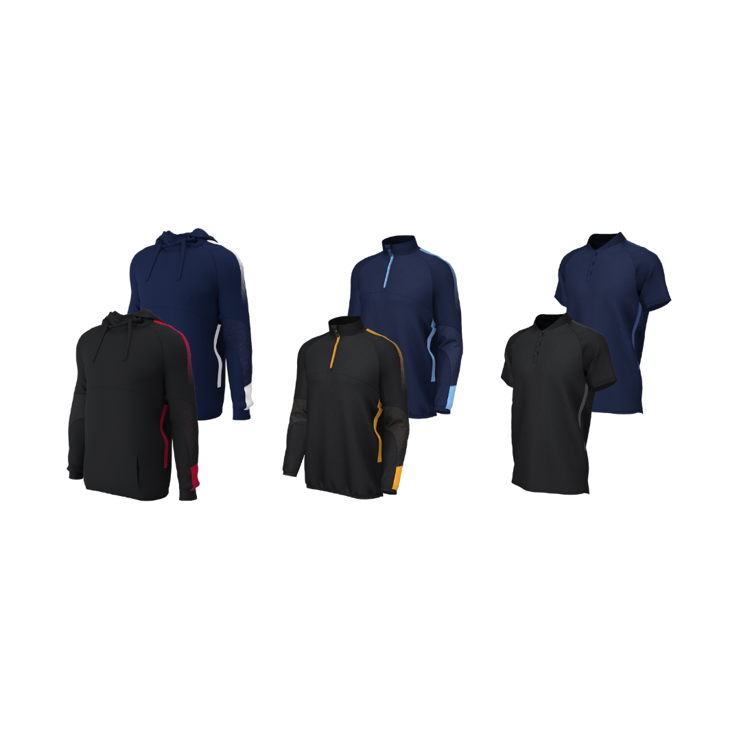 The essential selection! A great range of training items including hoodies, mid-layers, and polo shirts. Available in Black or Navy. Shirts feature contrast panels in an attractive array of popular colours. Available from stock for quick turnaround of club orders and ideal for club shops.